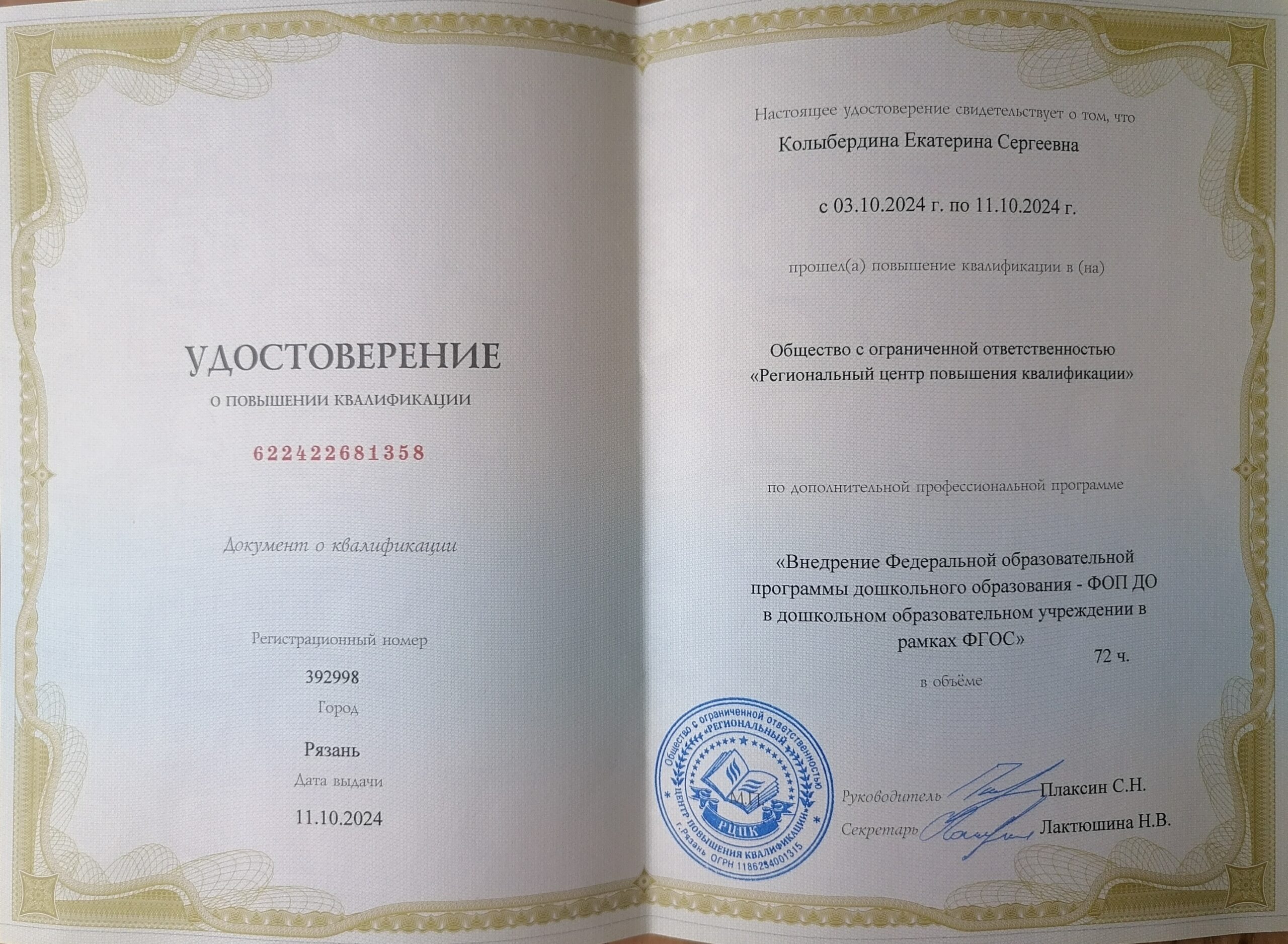 Курсы повышения квалификации: «Внедрение Федеральной образовательной программы дошкольного образования — ФОП ДО в дошкольном образовательном учреждении в рамках ФГОС» 2024